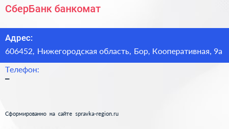 СберБанк, банкомат по адресу 606452, Нижегородская область, Бор, Кооперативная, 9а в дальнейшем Организация, размещена в следующих категориях: