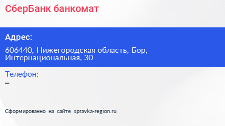 СберБанк, банкомат по адресу 606440, Нижегородская область, Бор, Интернациональная, 30 в дальнейшем Организация, размещена в следующих категориях: