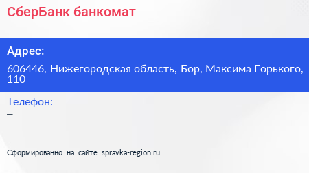 СберБанк, банкомат по адресу 606446, Нижегородская область, Бор, Максима Горького, 110 в дальнейшем Организация, размещена в следующих категориях: