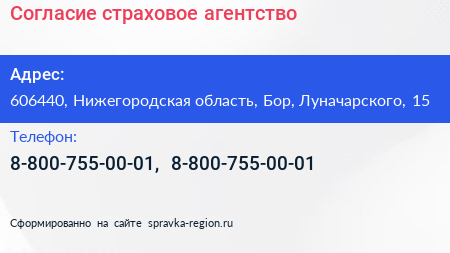 Согласие, страховое агентство по адресу 606440, Нижегородская область, Бор, Луначарского, 15 в дальнейшем Организация, размещена в следующих категориях:
