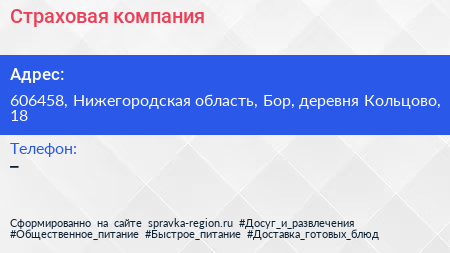 Страховая компания по адресу 606458, Нижегородская область, Бор, деревня Кольцово, 18 в дальнейшем Организация, размещена в следующих категориях: