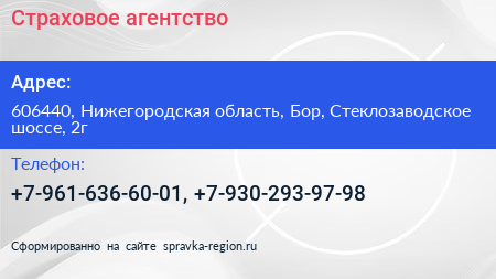 Страховое агентство по адресу 606440, Нижегородская область, Бор, Стеклозаводское шоссе, 2г в дальнейшем Организация, размещена в следующих категориях:
