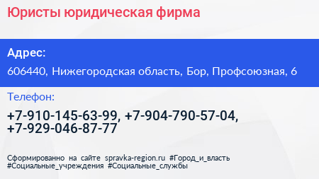 Юристы, юридическая фирма по адресу 606440, Нижегородская область, Бор, Профсоюзная, 6 в дальнейшем Организация, размещена в следующих категориях:
