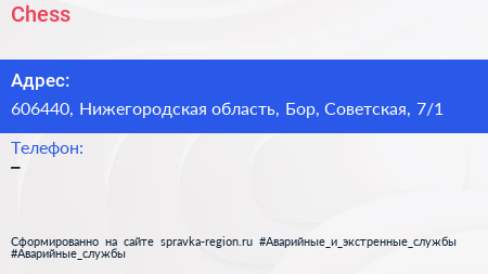 Chess по адресу 606440, Нижегородская область, Бор, Советская, 7/1 в дальнейшем Организация, размещена в следующих категориях: