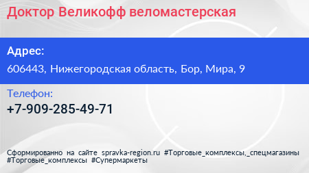 Доктор Великофф, веломастерская по адресу 606443, Нижегородская область, Бор, Мира, 9 в дальнейшем Организация, размещена в следующих категориях: