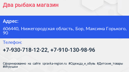 Два рыбака, магазин по адресу 606440, Нижегородская область, Бор, Максима Горького, 90 в дальнейшем Организация, размещена в следующих категориях: