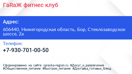 ГаRаЖ, фитнес-клуб по адресу 606440, Нижегородская область, Бор, Стеклозаводское шоссе, 2а в дальнейшем Организация, размещена в следующих категориях: