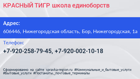 КРАСНЫЙ ТИГР, школа единоборств по адресу 606446, Нижегородская область, Бор, Нижегородская, 1а в дальнейшем Организация, размещена в следующих категориях: