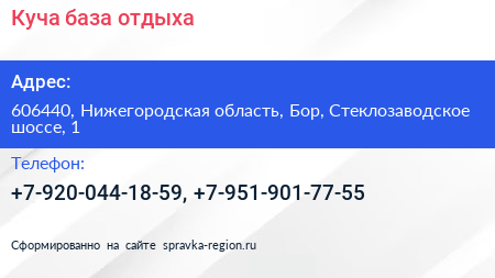 Куча, база отдыха по адресу 606440, Нижегородская область, Бор, Стеклозаводское шоссе, 1 в дальнейшем Организация, размещена в следующих категориях:
