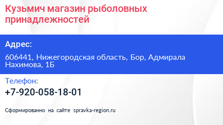 Кузьмич, магазин рыболовных принадлежностей по адресу 606441, Нижегородская область, Бор, Адмирала Нахимова, 1Б в дальнейшем Организация, размещена в следующих категориях: