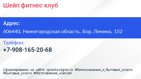 Шейп, фитнес-клуб по адресу 606440, Нижегородская область, Бор, Ленина, 152 в дальнейшем Организация, размещена в следующих категориях:
