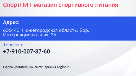 СпортПИТ, магазин спортивного питания по адресу 606440, Нижегородская область, Бор, Интернациональная, 35 в дальнейшем Организация, размещена в следующих категориях: