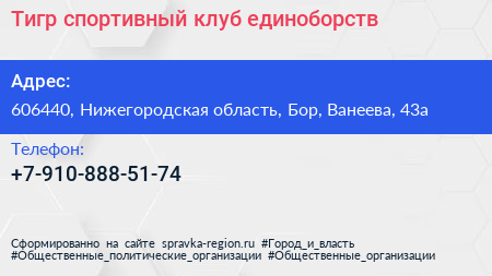 Тигр, спортивный клуб единоборств по адресу 606440, Нижегородская область, Бор, Ванеева, 43а в дальнейшем Организация, размещена в следующих категориях: