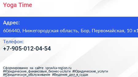 Yoga Time по адресу 606440, Нижегородская область, Бор, Первомайская, 10 к1 в дальнейшем Организация, размещена в следующих категориях: