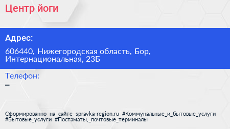 Центр йоги по адресу 606440, Нижегородская область, Бор, Интернациональная, 23Б в дальнейшем Организация, размещена в следующих категориях: