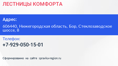 ЛЕСТНИЦЫ КОМФОРТА по адресу 606440, Нижегородская область, Бор, Стеклозаводское шоссе, 8 в дальнейшем Организация, размещена в следующих категориях: