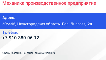 Механика, производственное предприятие по адресу 606446, Нижегородская область, Бор, Липовая, 2д в дальнейшем Организация, размещена в следующих категориях: