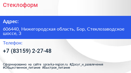 Адрес: Нижегородская область, Бор, Стеклозаводское шоссе, 2а/1