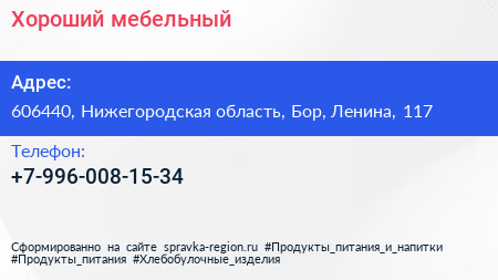 Хороший мебельный по адресу 606440, Нижегородская область, Бор, Ленина, 117 в дальнейшем Организация, размещена в следующих категориях: