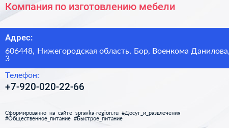 Компания по изготовлению мебели по адресу 606448, Нижегородская область, Бор, Военкома Данилова, 3 в дальнейшем Организация, размещена в следующих категориях: