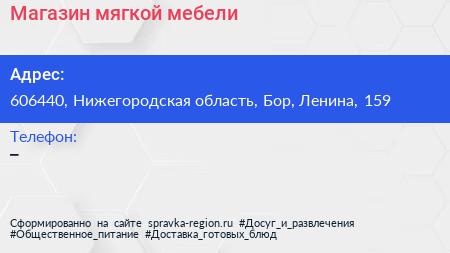 Магазин мягкой мебели по адресу 606440, Нижегородская область, Бор, Ленина, 159 в дальнейшем Организация, размещена в следующих категориях: