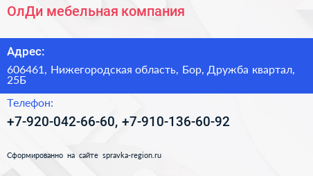 ОлДи, мебельная компания по адресу 606461, Нижегородская область, Бор, Дружба квартал, 25Б в дальнейшем Организация, размещена в следующих категориях: