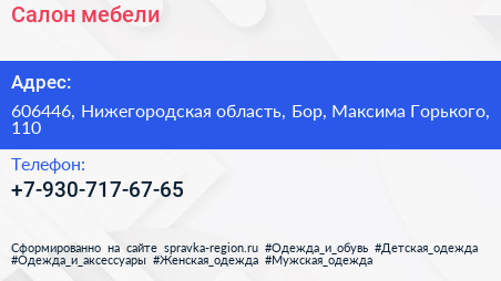 Салон мебели по адресу 606446, Нижегородская область, Бор, Максима Горького, 110 в дальнейшем Организация, размещена в следующих категориях: