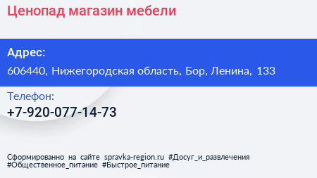 Ценопад, магазин мебели по адресу 606440, Нижегородская область, Бор, Ленина, 133 в дальнейшем Организация, размещена в следующих категориях: