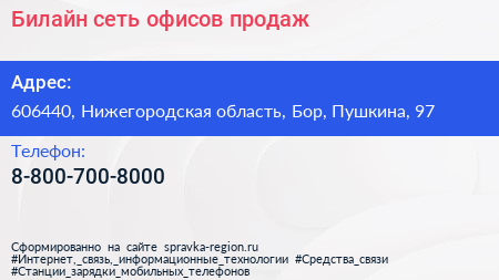 Билайн, сеть офисов продаж по адресу 606440, Нижегородская область, Бор, Пушкина, 97 в дальнейшем Организация, размещена в следующих категориях: