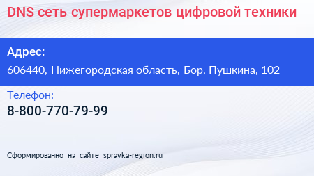 DNS, сеть супермаркетов цифровой техники по адресу 606440, Нижегородская область, Бор, Пушкина, 102 в дальнейшем Организация, размещена в следующих категориях: