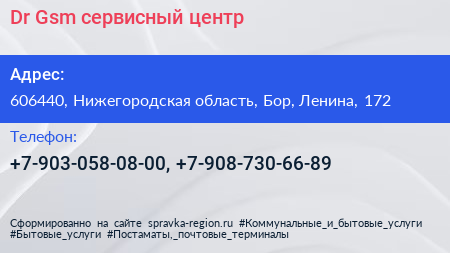 Dr.Gsm, сервисный центр по адресу 606440, Нижегородская область, Бор, Ленина, 172 в дальнейшем Организация, размещена в следующих категориях: