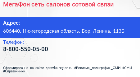 МегаФон, сеть салонов сотовой связи по адресу 606440, Нижегородская область, Бор, Ленина, 113Б в дальнейшем Организация, размещена в следующих категориях: