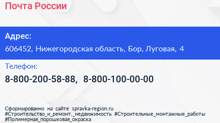 Почта России по адресу 606452, Нижегородская область, Бор, Луговая, 4 в дальнейшем Организация, размещена в следующих категориях: