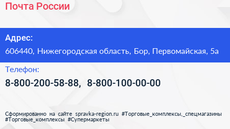 Почта России по адресу 606440, Нижегородская область, Бор, Первомайская, 5а в дальнейшем Организация, размещена в следующих категориях: