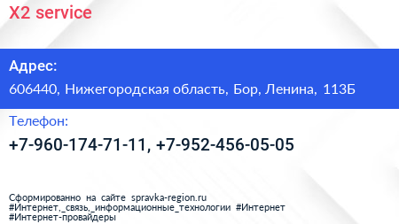 X2-service по адресу 606440, Нижегородская область, Бор, Ленина, 113Б в дальнейшем Организация, размещена в следующих категориях: