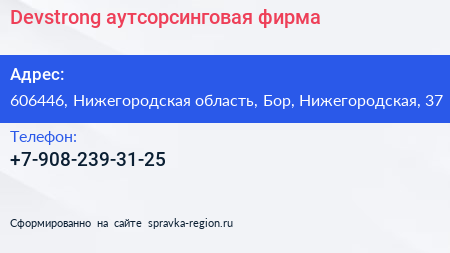 Devstrong, аутсорсинговая фирма по адресу 606446, Нижегородская область, Бор, Нижегородская, 37 в дальнейшем Организация, размещена в следующих категориях: