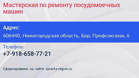 Мастерская по ремонту посудомоечных машин по адресу 606440, Нижегородская область, Бор, Профсоюзная, 6 в дальнейшем Организация, размещена в следующих категориях: