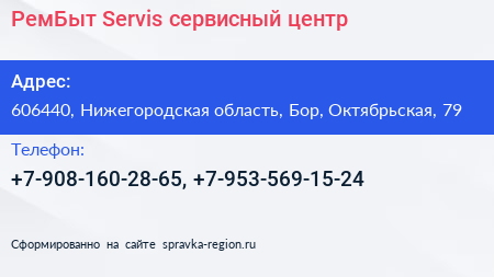 РемБыт Servis, сервисный центр по адресу 606440, Нижегородская область, Бор, Октябрьская, 79 в дальнейшем Организация, размещена в следующих категориях: