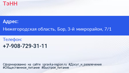 ТэНН по адресу Нижегородская область, Бор, 3-й микрорайон, 7/1 в дальнейшем Организация, размещена в следующих категориях:
