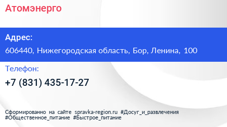 Атомэнерго по адресу 606440, Нижегородская область, Бор, Ленина, 100 в дальнейшем Организация, размещена в следующих категориях: