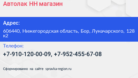 Автолак-НН, магазин по адресу 606440, Нижегородская область, Бор, Луначарского, 128 к2 в дальнейшем Организация, размещена в следующих категориях: