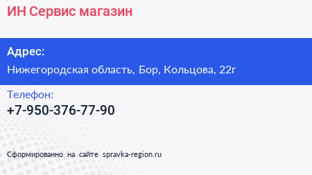 ИН-Сервис, магазин по адресу Нижегородская область, Бор, Кольцова, 22г в дальнейшем Организация, размещена в следующих категориях: