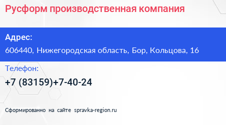 Русформ, производственная компания по адресу 606440, Нижегородская область, Бор, Кольцова, 16 в дальнейшем Организация, размещена в следующих категориях: