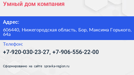 Умный дом, компания по адресу 606440, Нижегородская область, Бор, Максима Горького, 64а в дальнейшем Организация, размещена в следующих категориях: