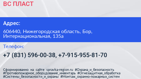ВС ПЛАСТ по адресу 606440, Нижегородская область, Бор, Интернациональная, 135а в дальнейшем Организация, размещена в следующих категориях: