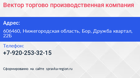 Вектор, торгово-производственная компания по адресу 606460, Нижегородская область, Бор, Дружба квартал, 22Б в дальнейшем Организация, размещена в следующих категориях: