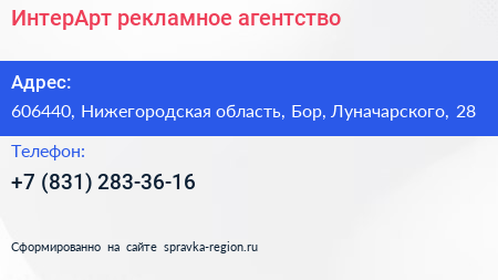 ИнтерАрт, рекламное агентство по адресу 606440, Нижегородская область, Бор, Луначарского, 28 в дальнейшем Организация, размещена в следующих категориях: