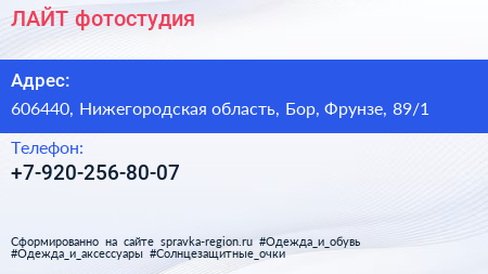 ЛАЙТ, фотостудия по адресу 606440, Нижегородская область, Бор, Фрунзе, 89/1 в дальнейшем Организация, размещена в следующих категориях: