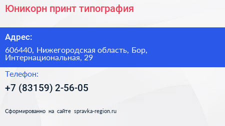 Юникорн принт, типография по адресу 606440, Нижегородская область, Бор, Интернациональная, 29 в дальнейшем Организация, размещена в следующих категориях: