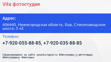 Vita, фотостудия по адресу 606440, Нижегородская область, Бор, Стеклозаводское шоссе, 3 к1 в дальнейшем Организация, размещена в следующих категориях: